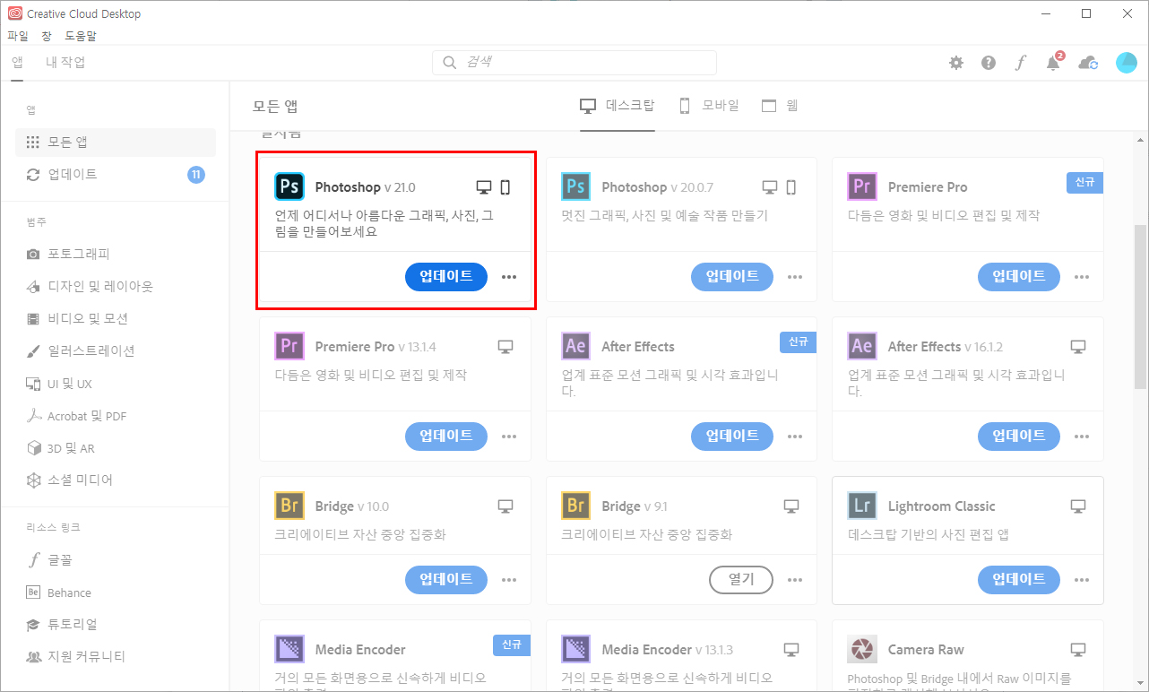 아시다시피 저희에게 필요한 건 Photoshop 2020 버전입니다. 저는 어쩌다 보니 CC 2019 버전까지 같이 깔려있는데요. 2019 버전을 깔고 싶으신 분들은 그 옆에 있는 버전을 설치하시면 되고, 저는 가장 최신 버전인 v21.0 버전으로 깔도록 하겠습니다. 물론 저는 이미 깔아놓은 상태라서.. 업데이트만 진행하게 되네요.