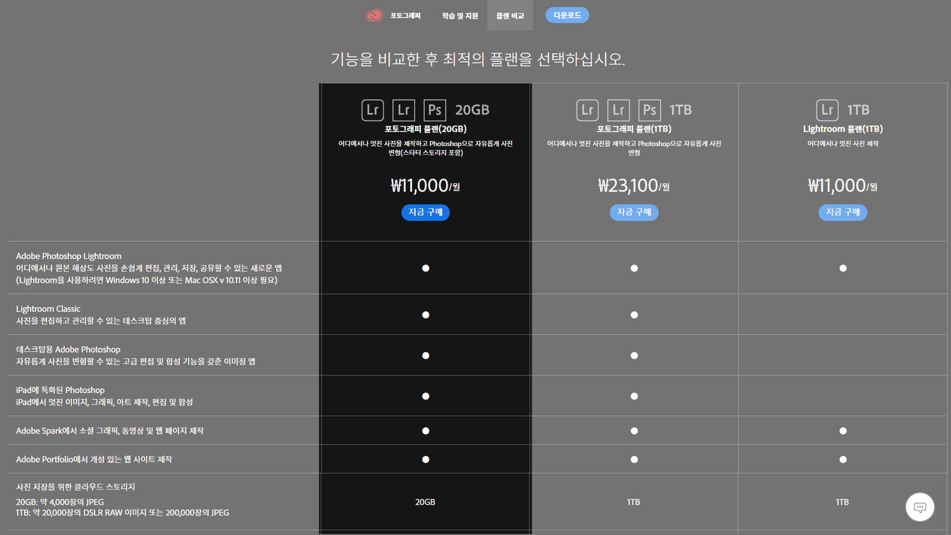 보통은 일반적으로 포토샵을 이용하시는 분들이 대부분이고, 요 근래에는 사진을 이용해서 보정하시는 분들이 많기 때문에 개인적으로는 포토그래퍼 플랜을 추천드리는 바입니다. 가격은 대략 월 11,000원 (부가세 별도)입니다.