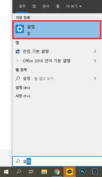 윈도우10을 사용하시는 분들 중에서 윈도우키를 누르고, 설정을 입력하신 후 설정을 들어갑니다.