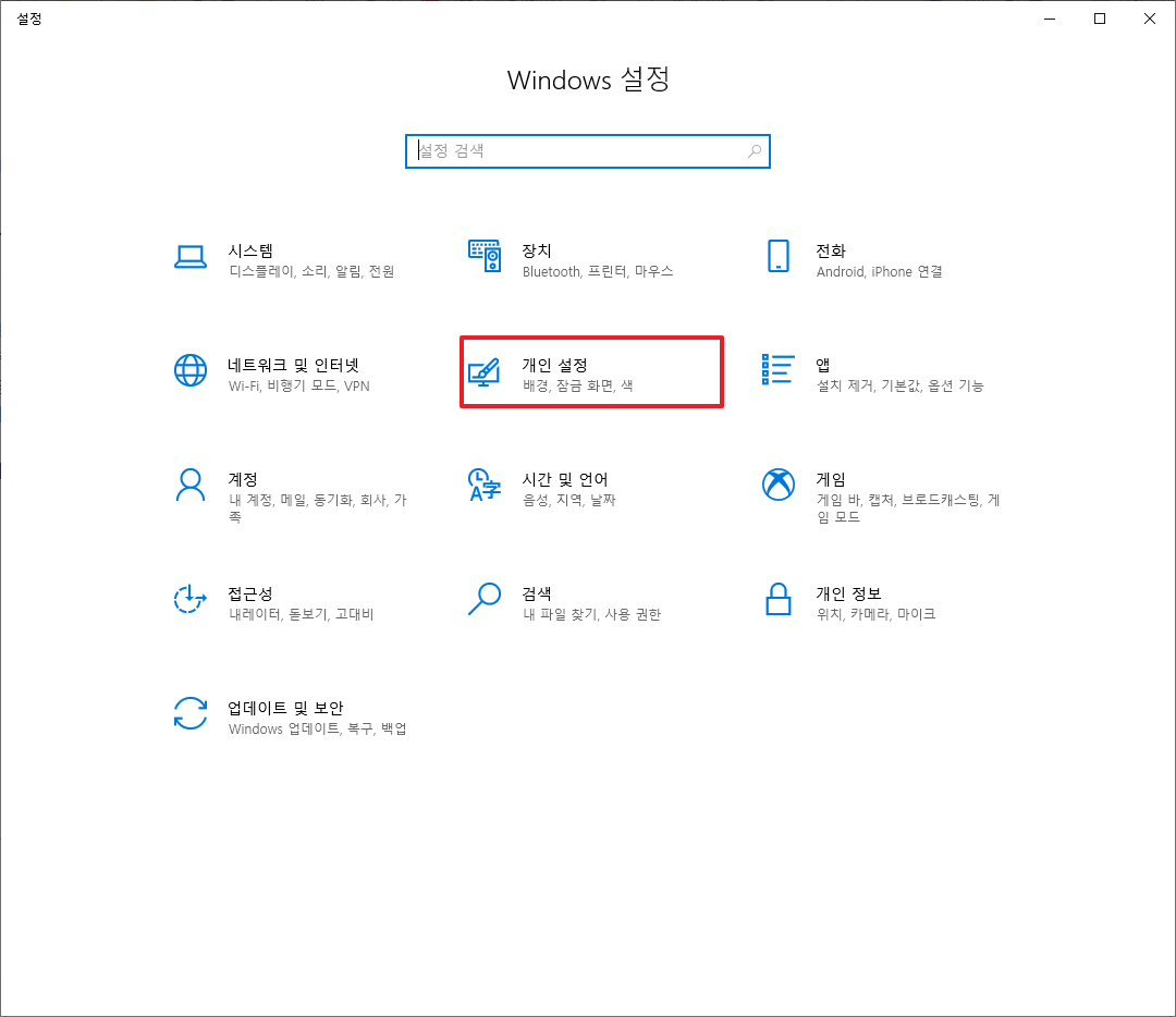 설정을 들어가시면 여러가지 설정 메뉴들이 있는데, 그중에서 개인 설정이라는 메뉴를 클릭합니다.