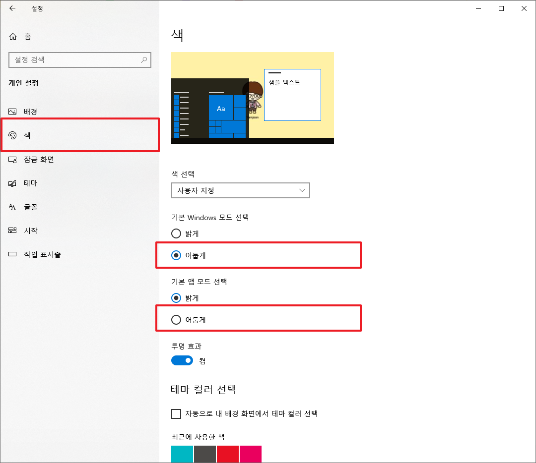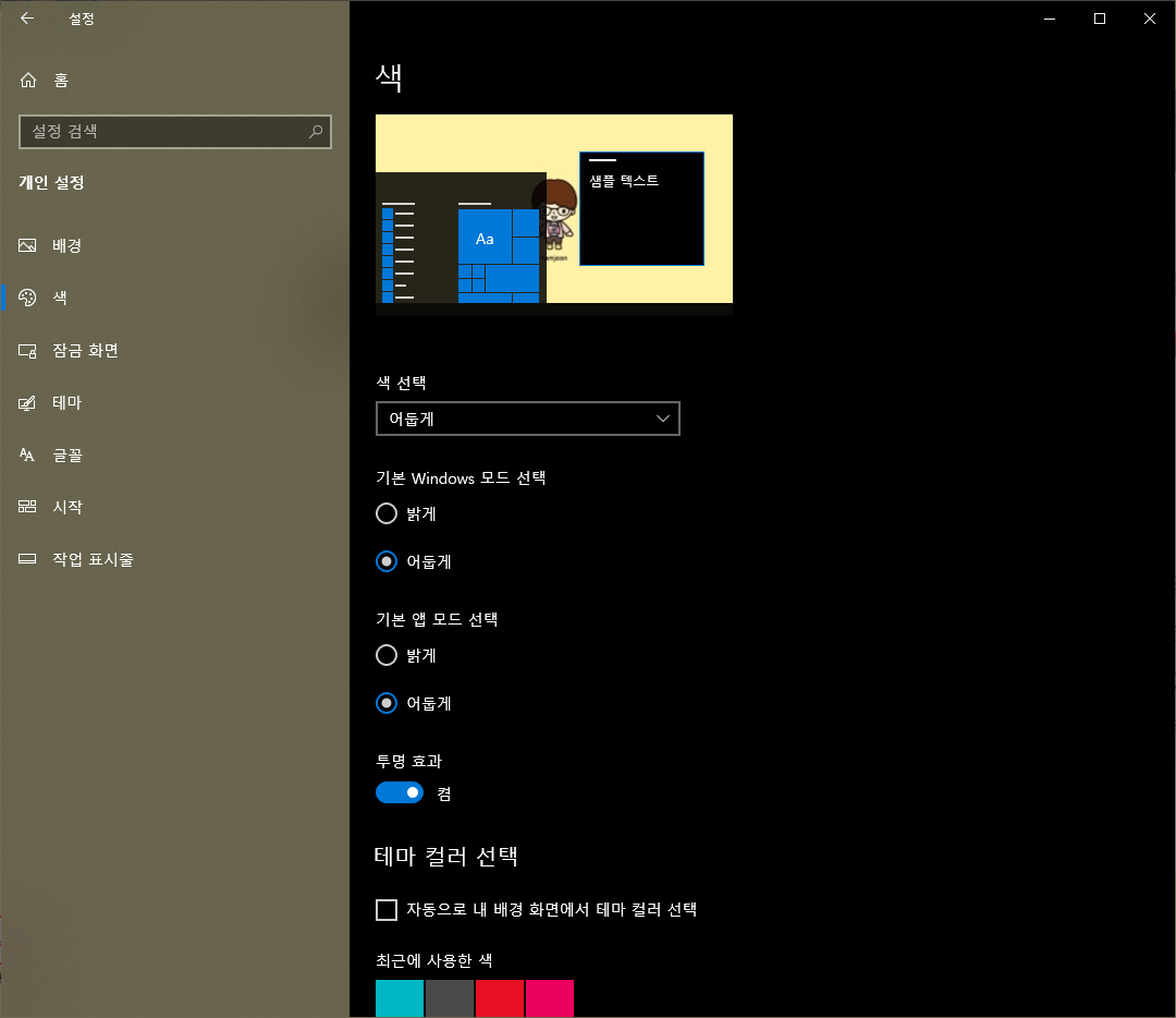 그리곤 왼쪽에 있는 색을 누르시고, Window모드를 어둡게 설정하시고, 기본 앱 모드 또한 어둡게 설정해주세요.