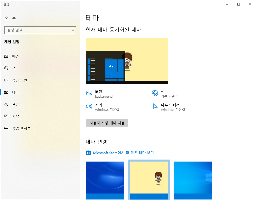 여기에서는 바탕화면의 전반적인 테마라던가, 소리, 마우스 커서 등을 설정할 수 있는 곳입니다. 여기에서 밑으로 스크롤을 내려보시면,
