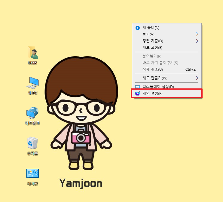 이렇게 나와있는 아이콘들을 없애보도록 하겠습니다. 우선은 바탕화면에서 오른쪽 마우스를 클릭합니다. 그러면 목록이 여러가지가 나옵니다.