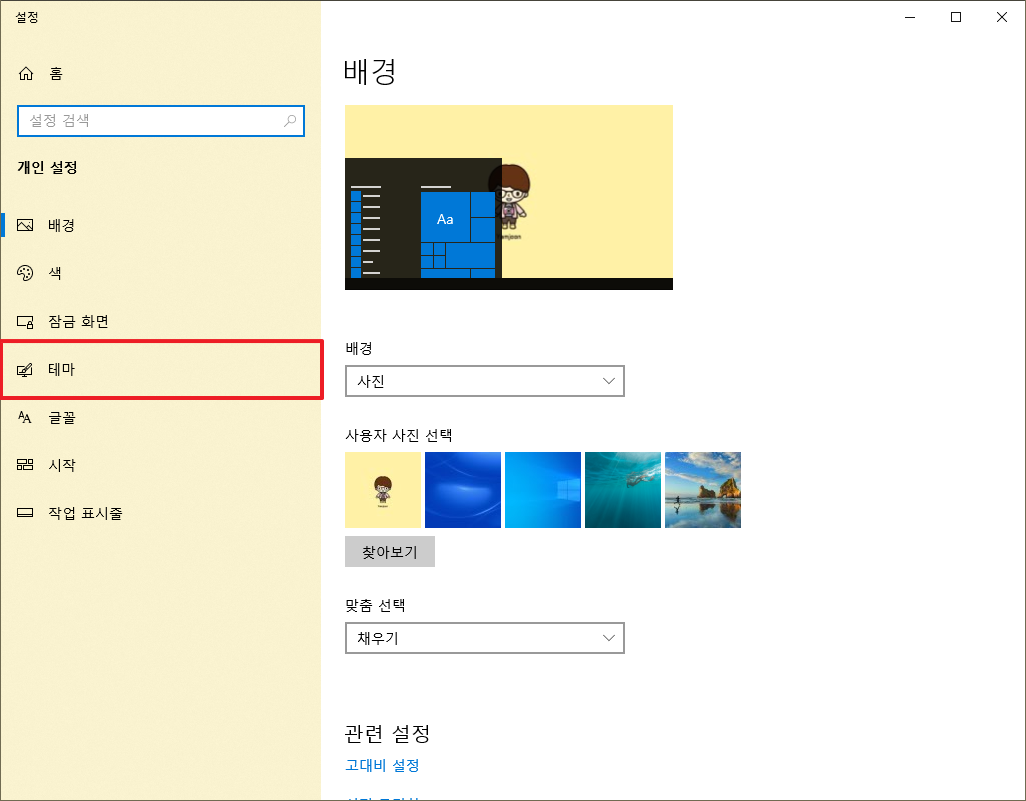 이렇게 개인설정으로 들어오면 오른쪽에 많이 메뉴들이 있는데, 이 중에서 [테마]를 들어갑니다.