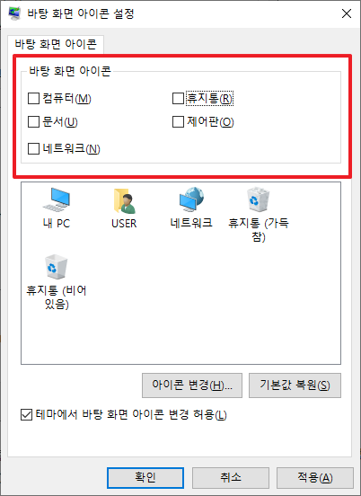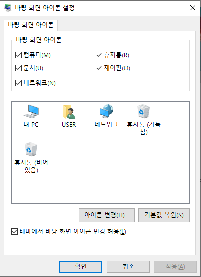 이렇게 체크를 해제하시면, 이제 바탕화면에서 아이콘들이 사라지게 될 것입니다. 또는 만들고자 하시는 분들은 체크를 하시면 생성이 될 것 입니다.