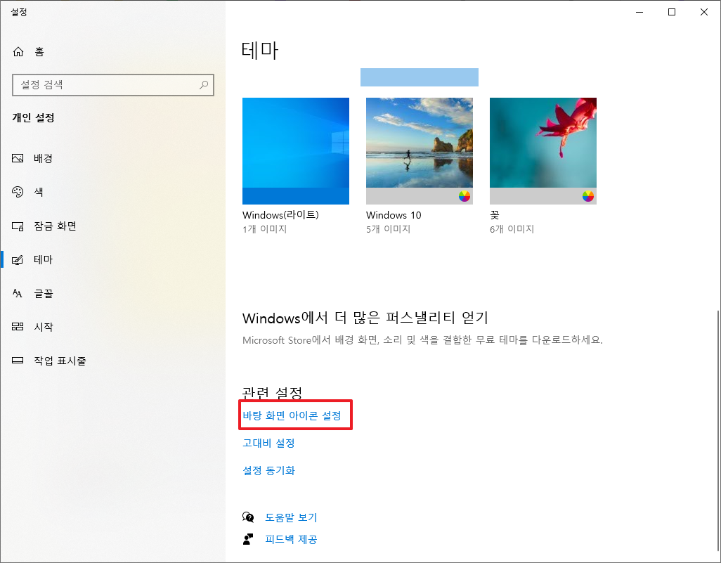 이렇게 하단으로 내려가면 바탕 화면 아이콘 설정이라는 메뉴가 있습니다. 바탕화면 아이콘 설정 메뉴를 클릭하시면