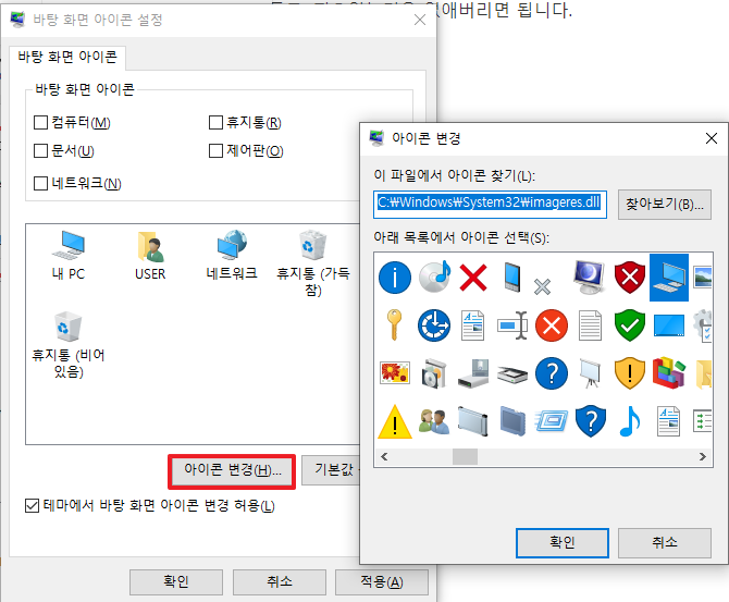 아이콘을 바꾸고 싶으신 분들은 여기 아이콘 변경에서 아이콘을 변경시켜주시면 됩니다. 그러고보니 어릴 때 커스텀 배경화면 만들고 싶어서 이걸 많이 건들여봤던거 같네요. 이래저래 다른 아이콘들 찾아서 적용했던 기억이 나네요.
