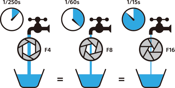 수도꼭지의 굵기가 조리개라고 하고, 시간을 셔터 속도라고 한다면 물이 받아지는 양이 곧 밝기를 결정하는 것이죠.