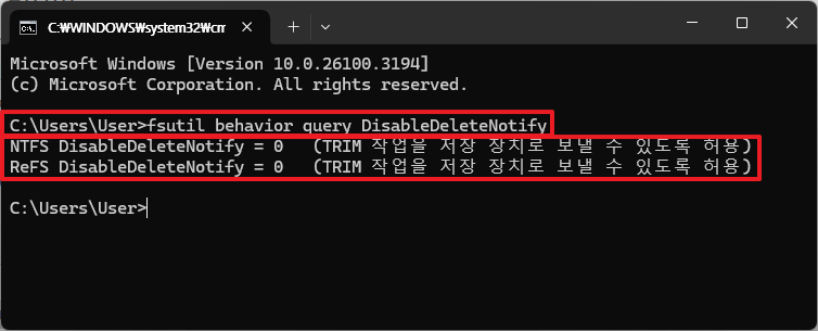 - Trim이 활성화되지 않았다면 명령 프롬프트(CMD)에서 다음 명령어 입력: