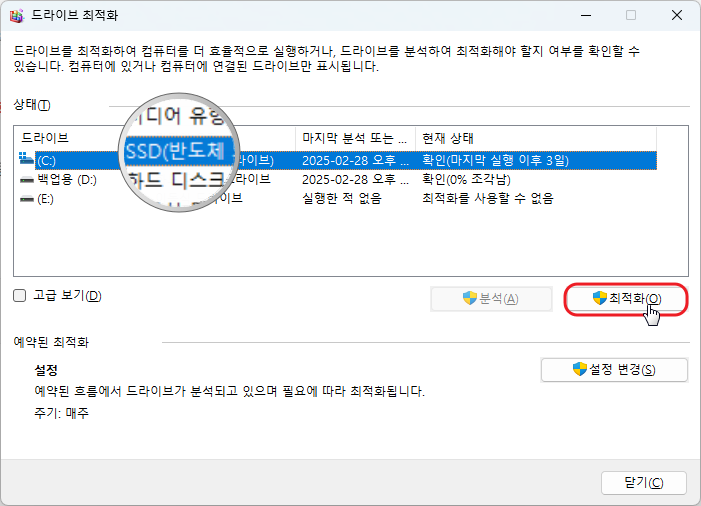 - SSD 드라이브 선택 → 최적화 버튼 클릭