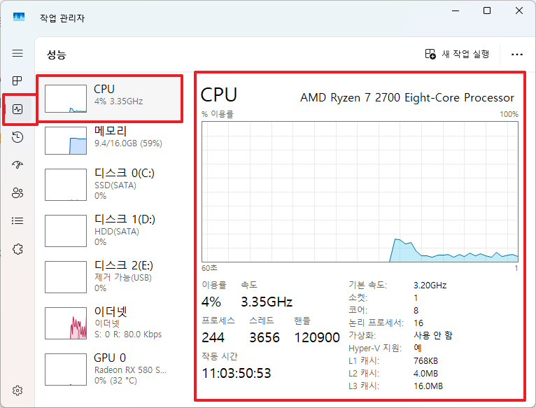 - CPU 모델명, 현재 속도, 사용량, 코어 개수 확인 가능.
